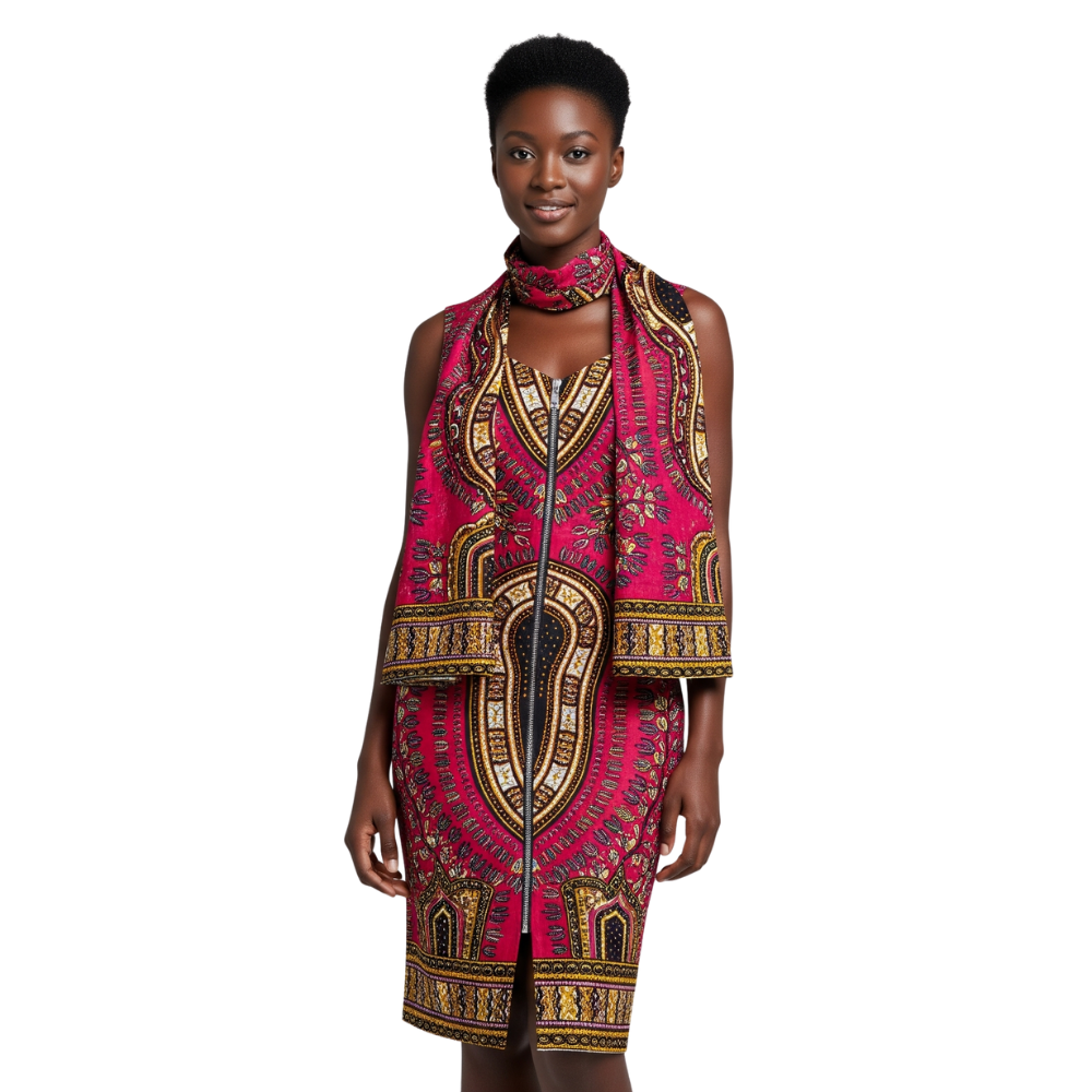 What sets this dress apart is the thoughtfulness in its design. Complementing the sleeveless cut and knee-length silhouette is a lightweight scarf that adds flair and versatility to your outfit. Whether worn loosely draped or styled to suit your own personal preferences, the scarf enhances your overall look. The accompanying satin belt is a showstopper that cinches your waist and accentuates your figure, providing a touch of luxury to the dress. Together, these elements create an outfit that combines function and fashion seamlessly.